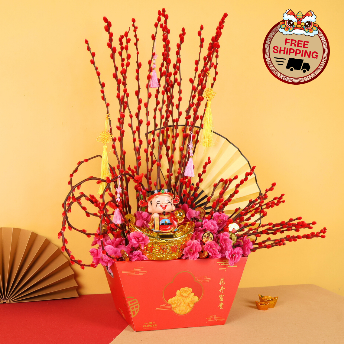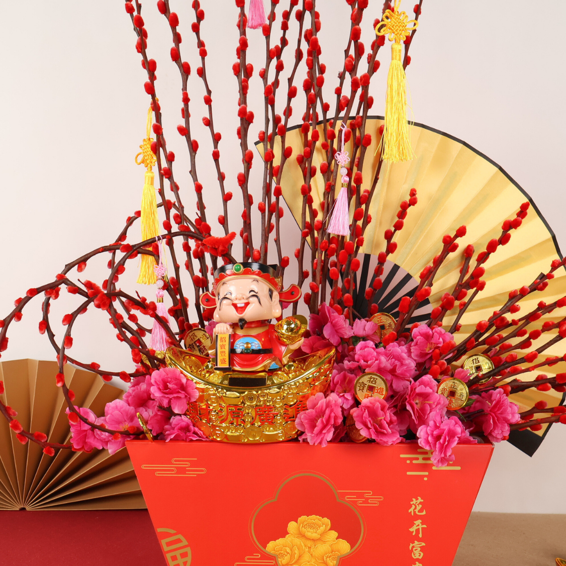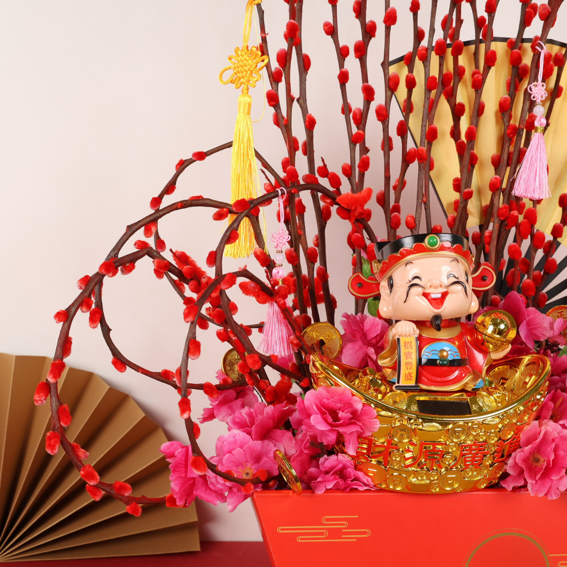 Flowers: Pussy Willows with Fortune God and festive ornaments.