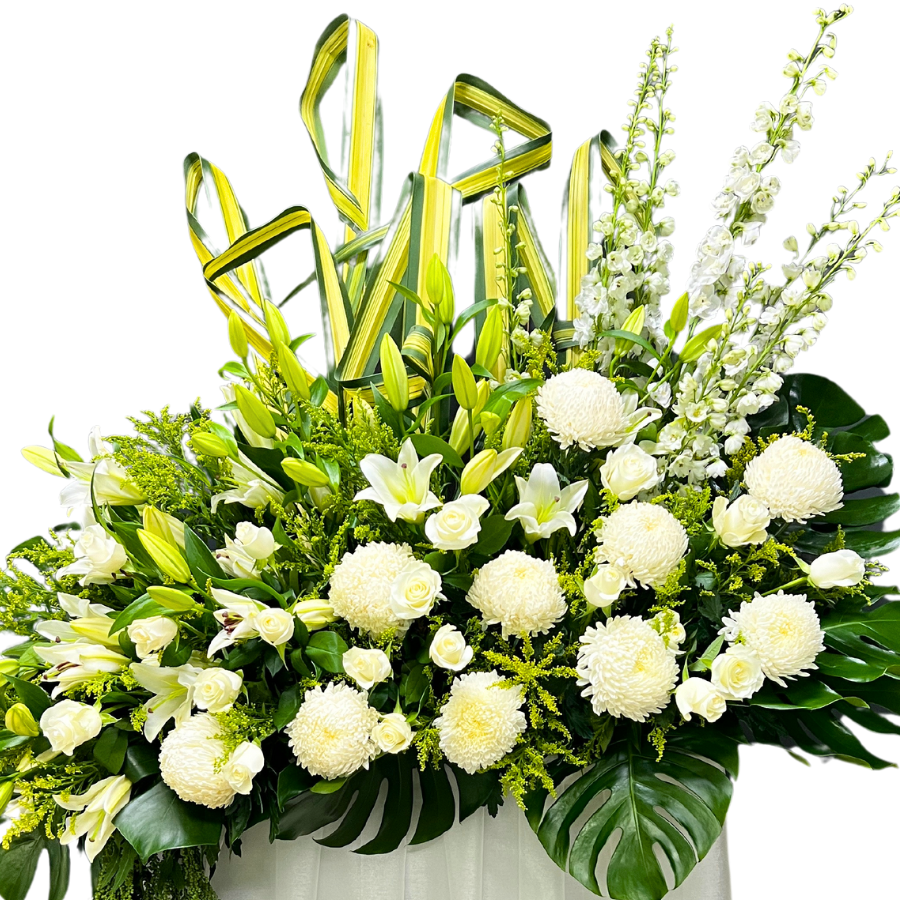 Express heartfelt sympathy and solace with our dignified condolence flower stands, delicately curated to offer comfort during difficult times. Each stand features serene blooms selected to provide a heartfelt tribute to honor the memory of a loved one. Pay your respects with grace and elegance through our condolence flower stands, offering a meaningful gesture of sympathy and remembrance.