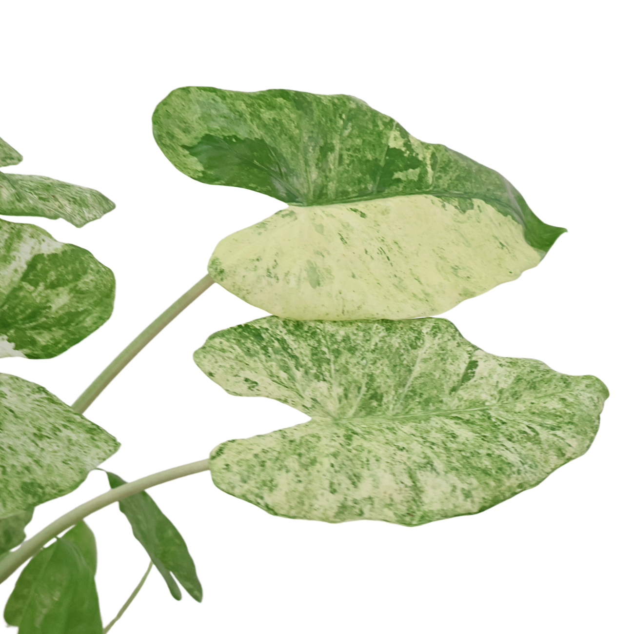 Alocasia Cucullata variegated, also known as the variegated Buddha's Palm, is a captivating tropical plant celebrated for its unique foliage. Native to Southeast Asia, it is characterized by its distinctive leaf shape and striking variegation patterns.