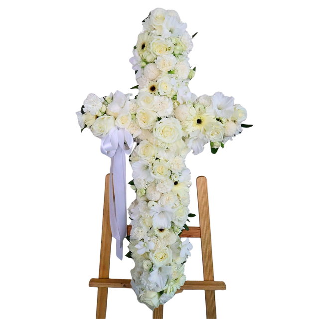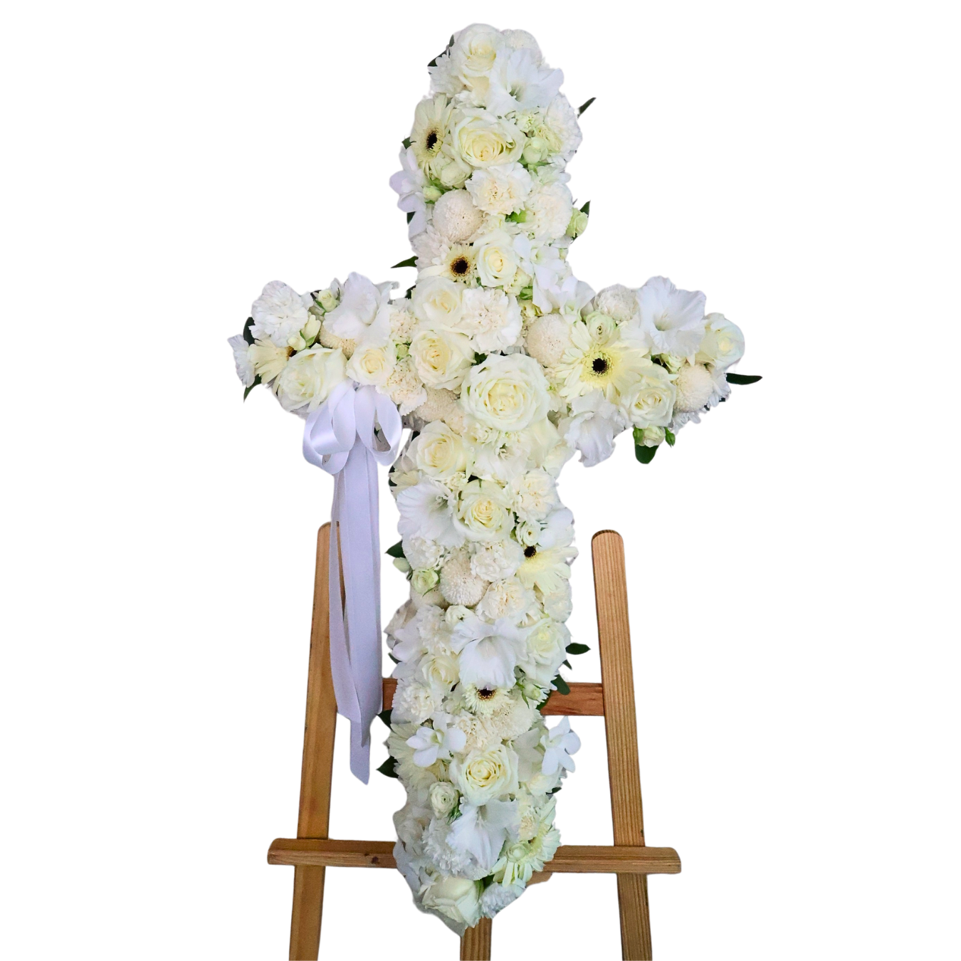 Honor the memory of a loved one with our elegant cross-shaped flower stand. Carefully crafted with fresh seasonal blooms and lush greenery, this floral tribute stands as a symbol of peace, faith, and eternal love. Ideal for funeral services, memorials, or church ceremonies.