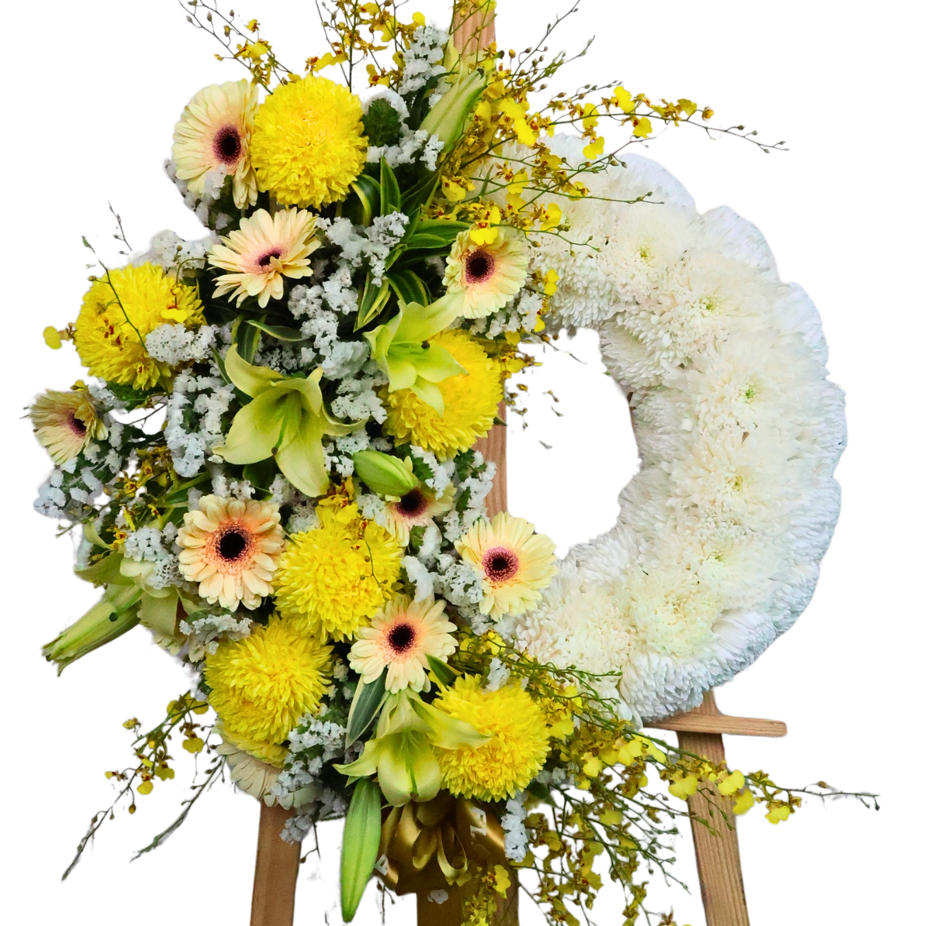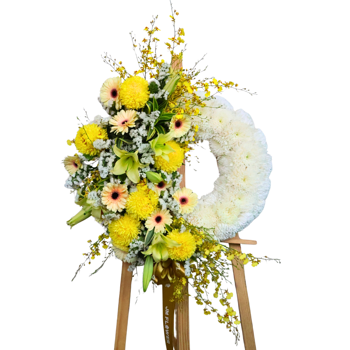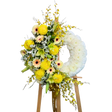 Honor the memory of a loved one with our elegant flower stand. Carefully crafted with fresh seasonal blooms and lush greenery, this floral tribute stands as a symbol of peace, faith, and eternal love. Ideal for funeral services, memorials, or church ceremonies.