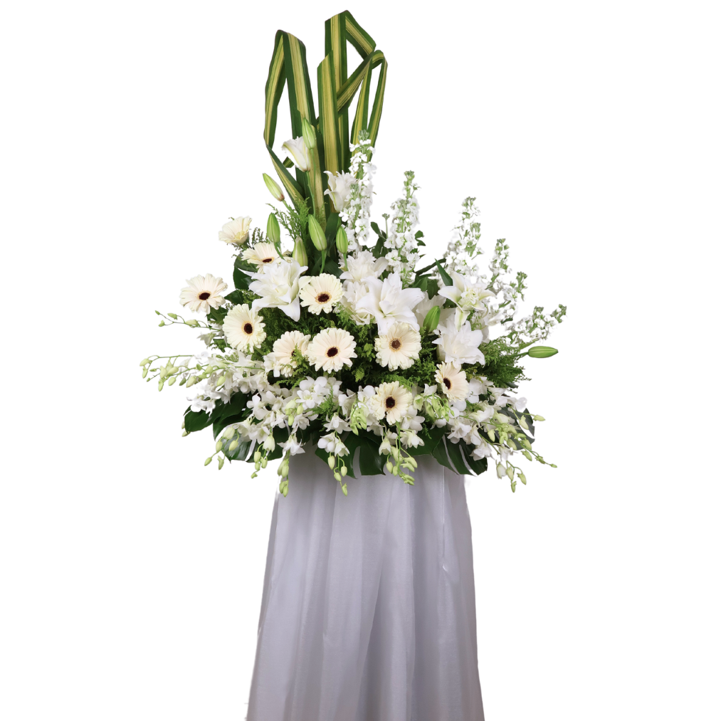 Express heartfelt sympathy and solace with our dignified condolence flower stands, delicately curated to offer comfort during difficult times. Each stand features serene blooms selected to provide a heartfelt tribute to honor the memory of a loved one. Pay your respects with grace and elegance through our condolence flower stands, offering a meaningful gesture of sympathy and remembrance.