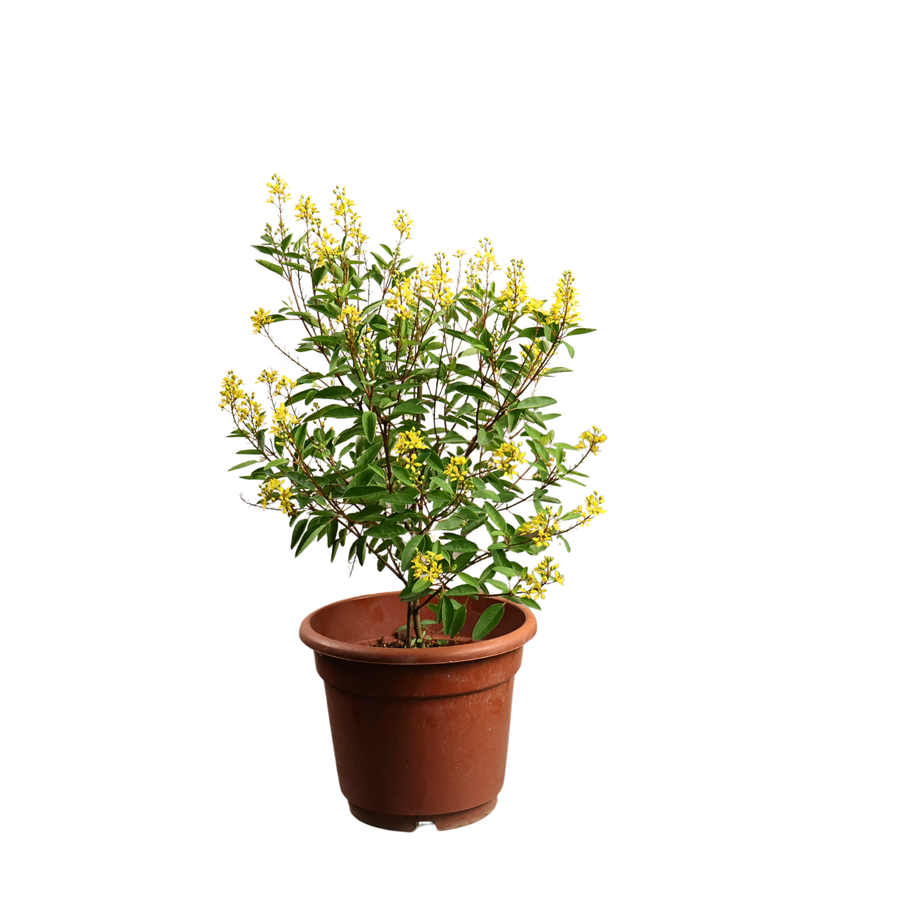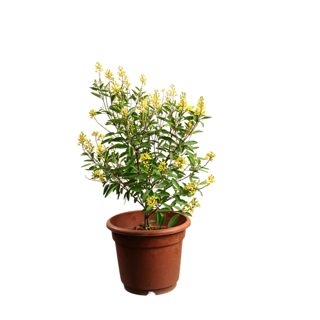 Golden Thryallis has light green leaves and young reddish stems, brightened by clusters of yellow flowers almost year-round. Its colorful foliage and flowers make it a great choice for garden borders and hedges.