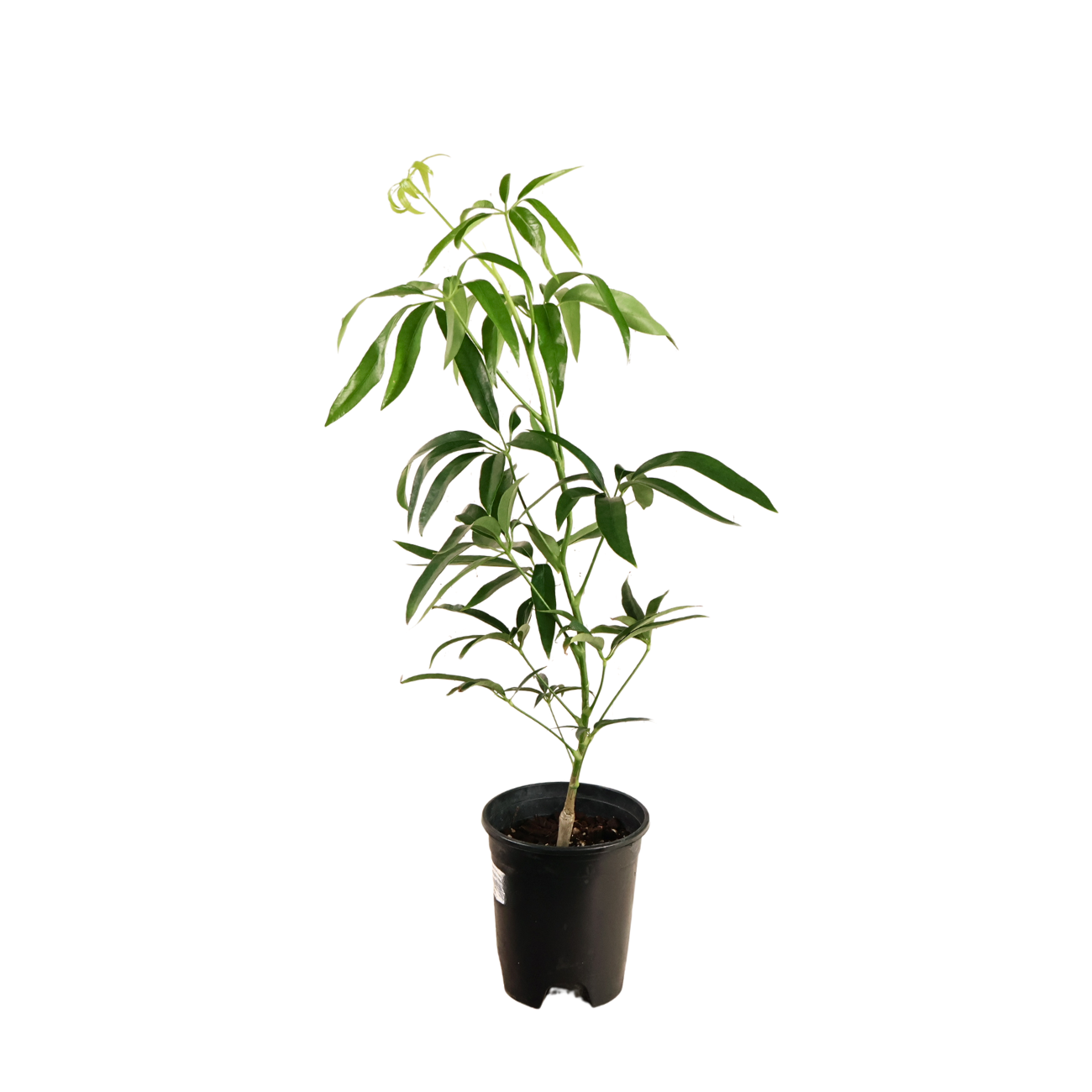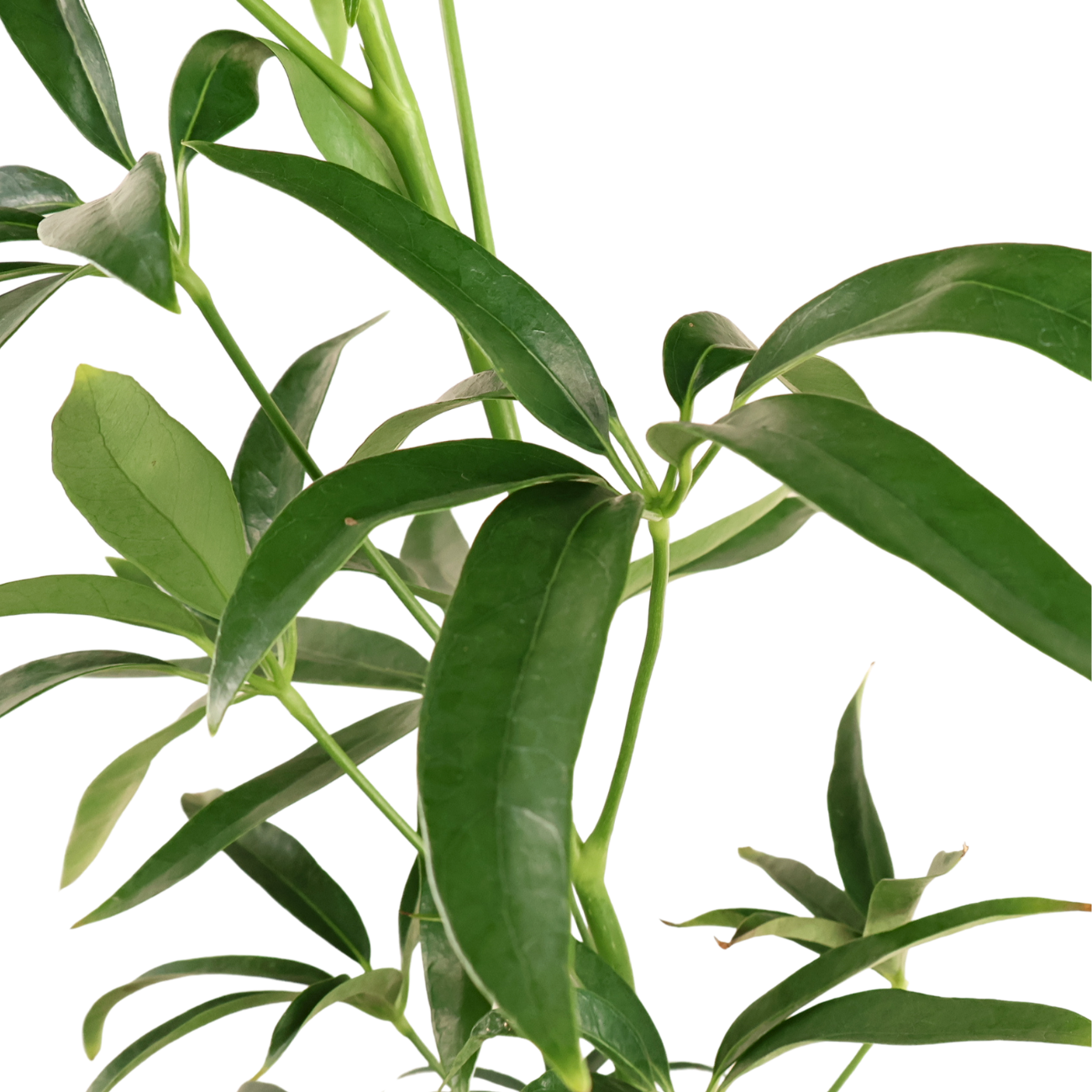 Heptapleurum commonly known Elliptic-Leaved Schefflera is an evergreen shrub with glossy leaves made up of 7-9 oval leaflets arranged like an umbrella. Its dense green foliage brightens any space and is often used for hedges and screens.