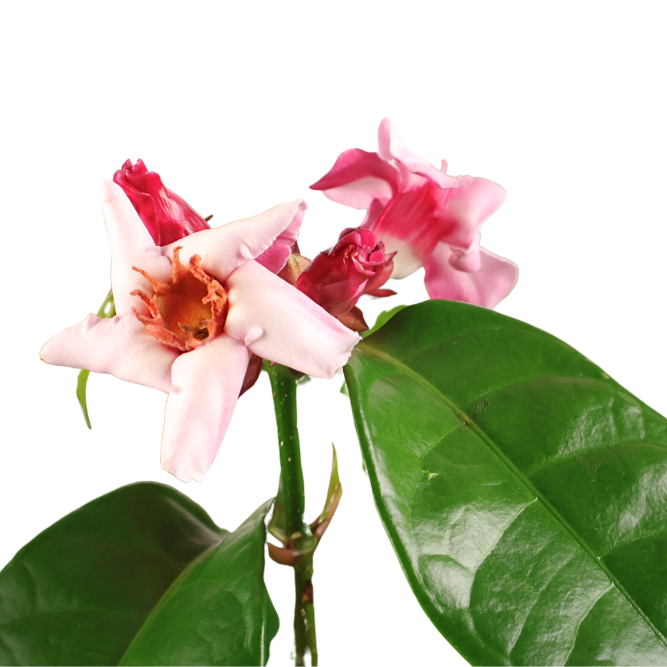 Strophanthus Gratus, or Poison Arrow Vine, produces fragrant, star-shaped flowers in white, cream, or pinkish hues. This woody vine can grow up to 10 meters long, climbing trees or spreading across vegetation. Due to its highly toxic seeds, it should be handled with care.