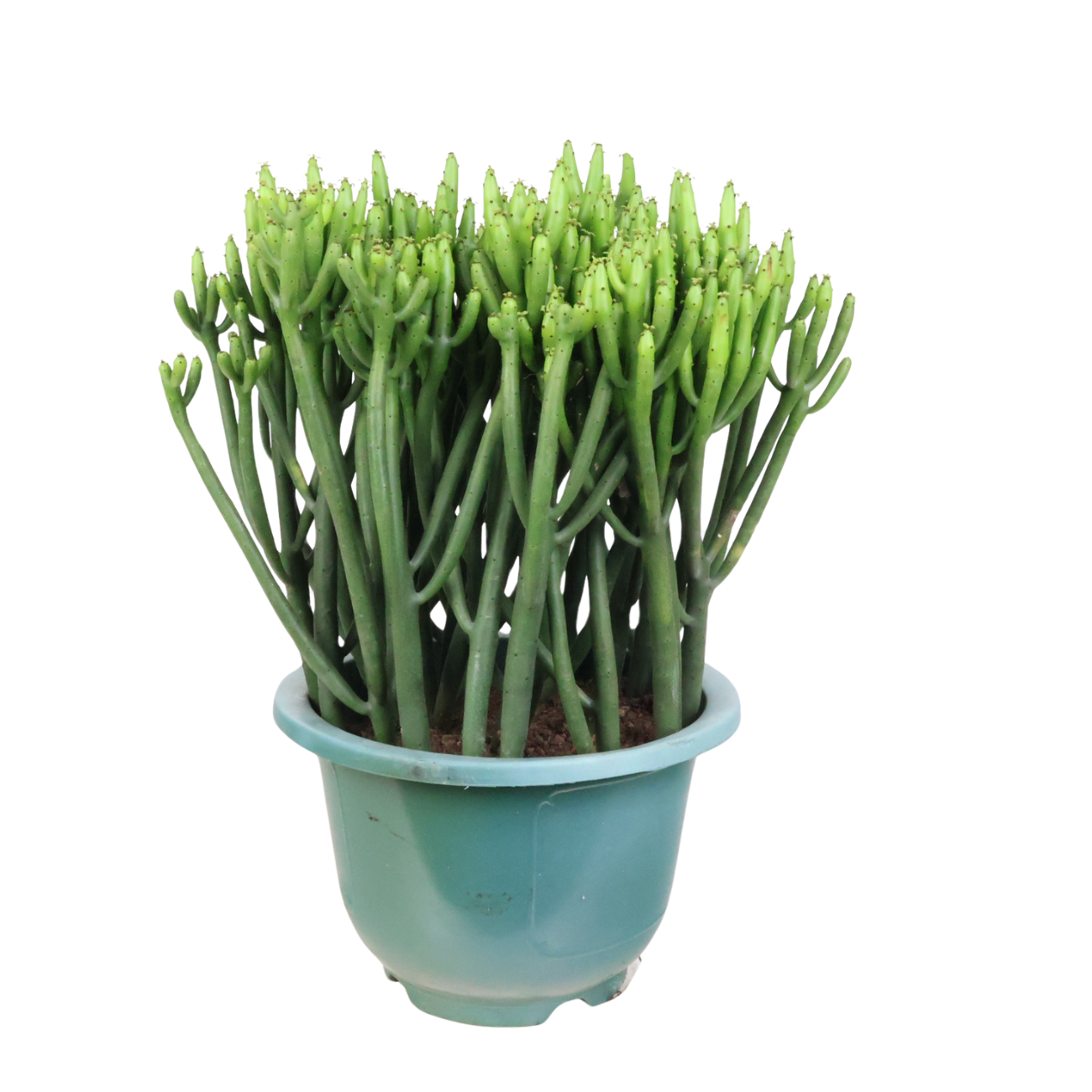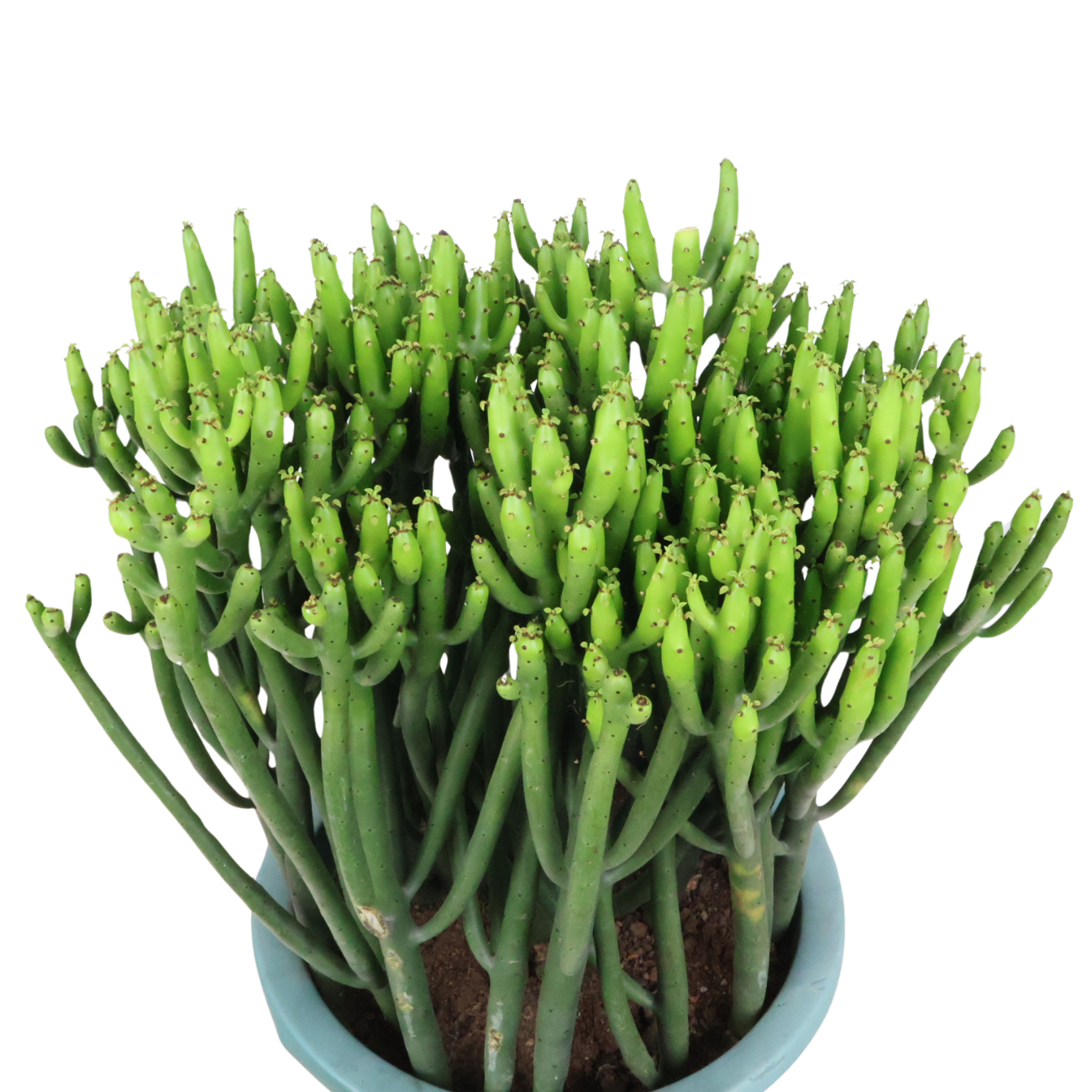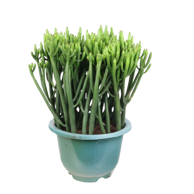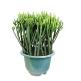 Euphorbia Alluaudii, commonly known as Cat Tails Euphorbia, is a unique succulent native to Madagascar. It features upright, spineless green stems with tiny, scale-like leaves and produces small, greenish-yellow flowers.